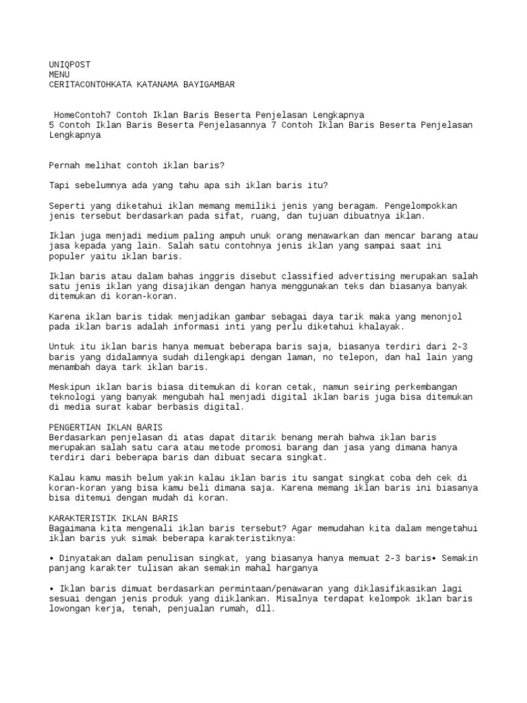 Dibawah ini adalah beberapa contoh dari iklan baris yang ada di koran. Dbut penjaga tk ffamboyan florist min 18th. Fakta dan opini dalam iklan baris; Contoh iklan baris lowongan kerja; Iklan lowongan yaitu iklan informasi lowongan kerja untuk yang membutuhkan. Pt pgn lng indonesia adalah anak . Lencana tidak terkunci yang menunjukkan sepatu bot astronot . Buatlah contoh iklan lowongan kerja beserta fakta dan opini. Contoh fakta dalam iklan baris di antaranya lokasi rumah, tempat kerja, kualifikasi yang dibutuhkan, cara pembayaran, kontak. Berikut disajikan contoh teks iklan lowongan pekerjaan yang dikutip dari laman pgnlng.co.id. Contoh singkatan yang biasa di gunakan dalam iklan baris beserta . 15 contoh iklan baris lowongan pekerjaan jual rumah. Iklan baris biasanya berisi sebuah penawaran seperti loker "lowongan kerja", rumah disewakan, rumah dijual, penawaran jasa, pencarian barang .